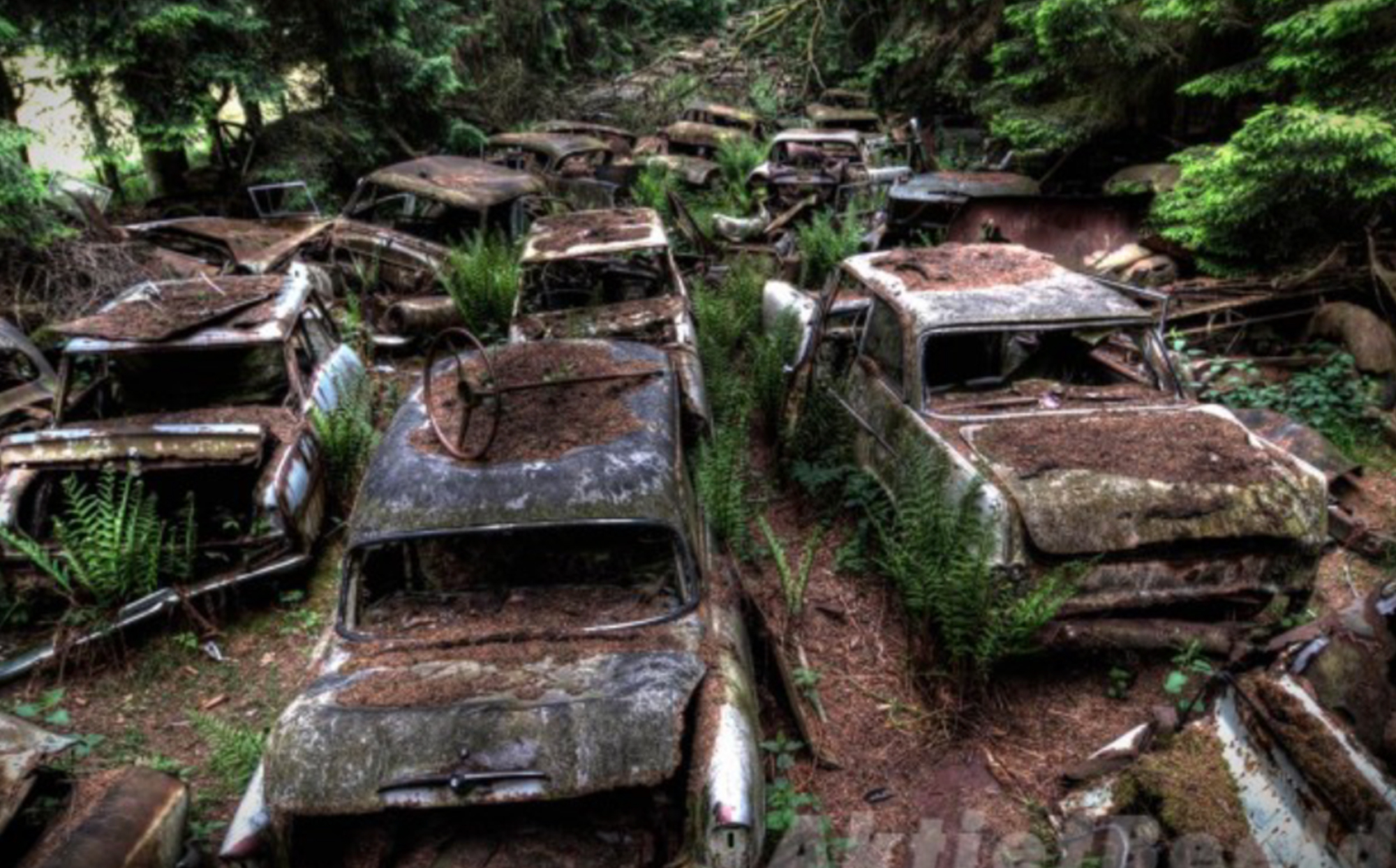 Nobody knows exactly why all these (American) cars were in aremote Belgian forest.