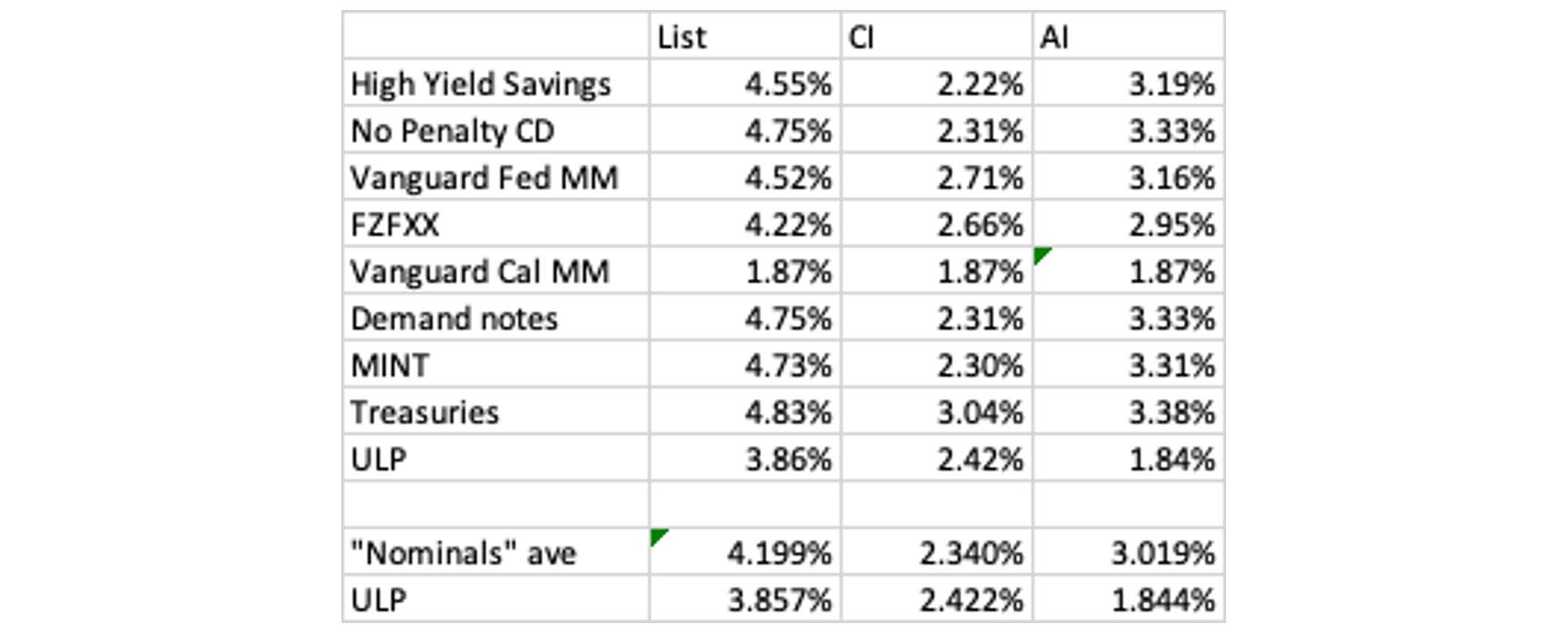 How does this play out in practice? Let's take the real world options as of today, assuming 2023 tax exposures. We'll simply list the "quoted" yield, the actual after tax yield for a high income California investor (CI), and the actual after tax yield for an "average" investor (AI) who pays 22% federal tax and 4% state tax.