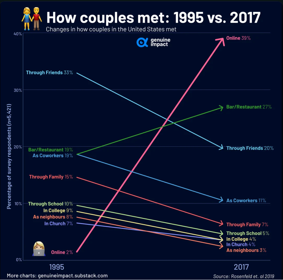 I met my wife online in 2005 on a site called eHarmony. It uses a match-based system to deliver a pre-screened list of candidates, and the reported divorce rate amongst e-Harmony couples is about 1/18th the usual US rate (3.86% vs. well over 50%).
