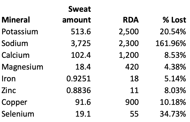 A surprising argument I heard against exercise is that sweat contains important minerals that our body is starved for. I did an analysis vs. RDA, and the two minerals to focus on are Potassium and Selenium (most of us already overconsume sodium). Maybe my post workout snack could be half a banana and half a brazil nut?