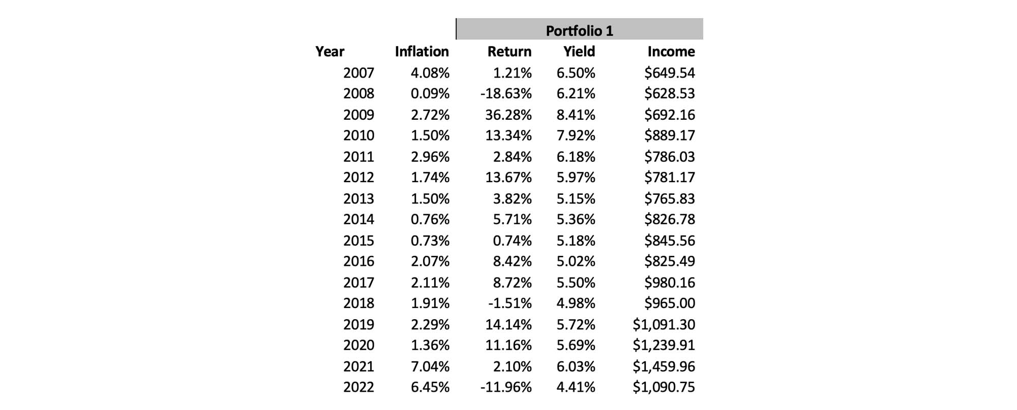 If you put $10,000 scattered across a variety of these strategies (about 10%-15% each). The value of your investment would look pretty terrible as you approached the end of 2008 - looks like you lost about 20% of your money!*. But the income only went down about 3%. 2022 the portfolio lost 12% and its income went down 25% - not ideal, but still far greater income than you would have received from “nominally protected” sources.