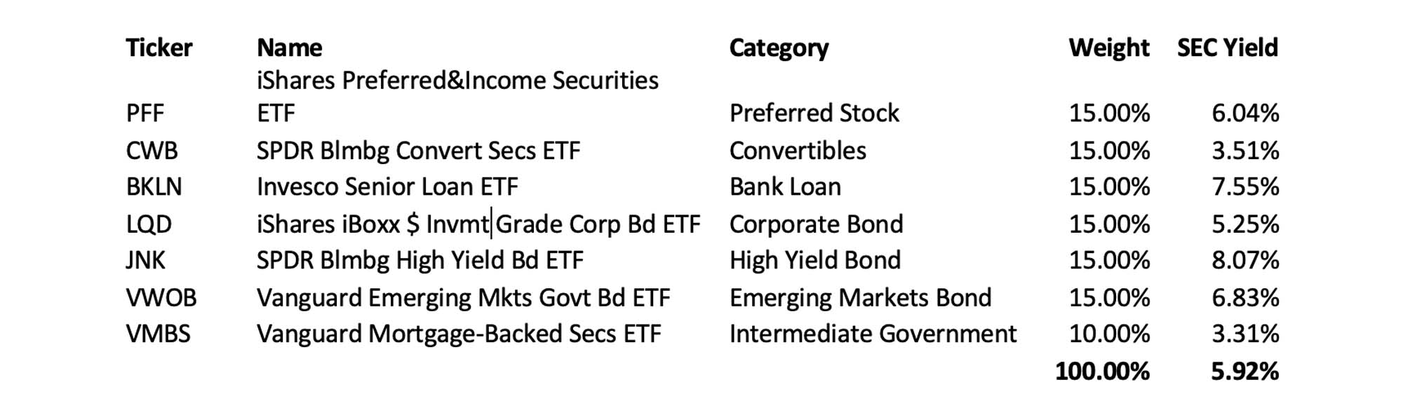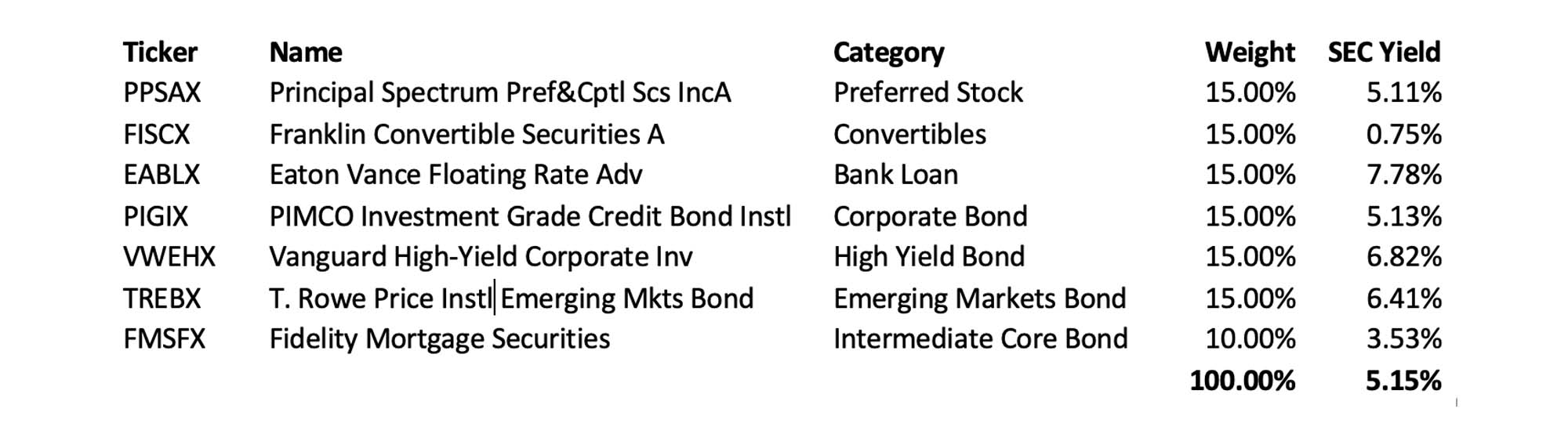 The ETFs I listed above, since they are lower cost, are a slightly different mix, and because of a quirk in how convertible yield is calculated, have a higher yield 5.92% vs. the 5.15% listed above. Note – some differences in timing can change SEC yield calcs slightly. This mix could be tweaked depending on your goals. For example if you wanted to seek more income you might reduce mortgage securities and increase convertible and high yield securities. If you wanted more growth and cared less about principal protection, you would add in a dividend growth fund such as VYM and subtract some mortgage securities.